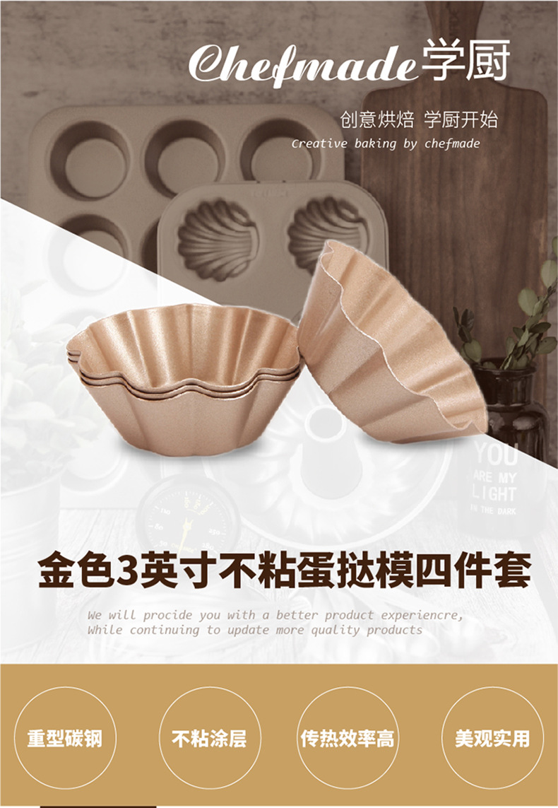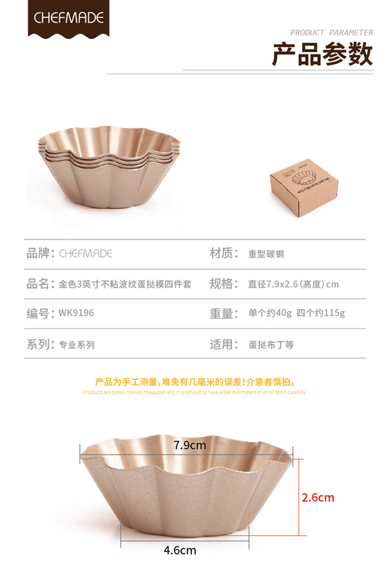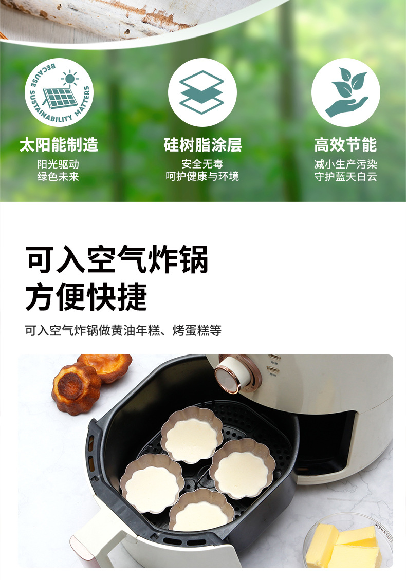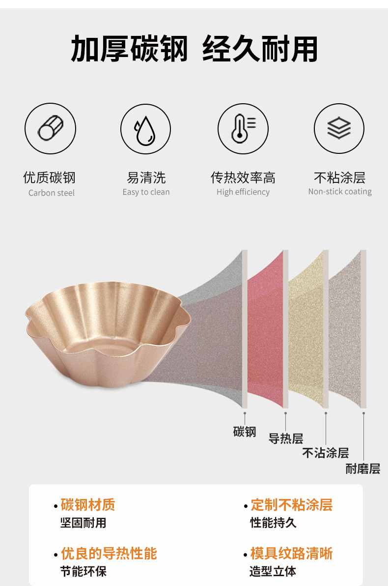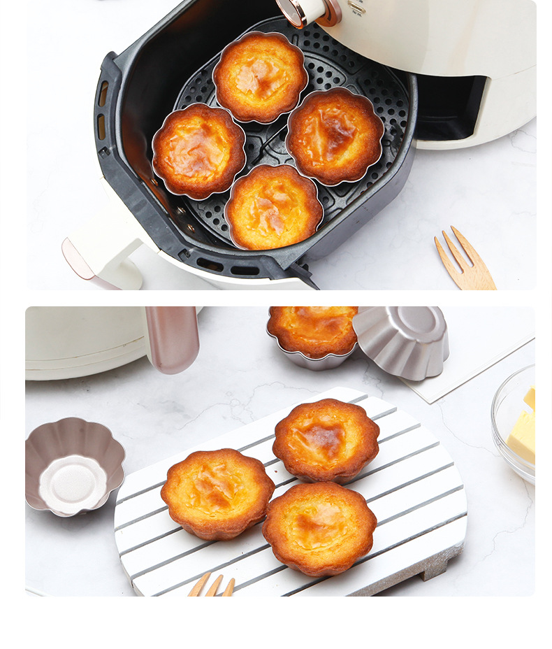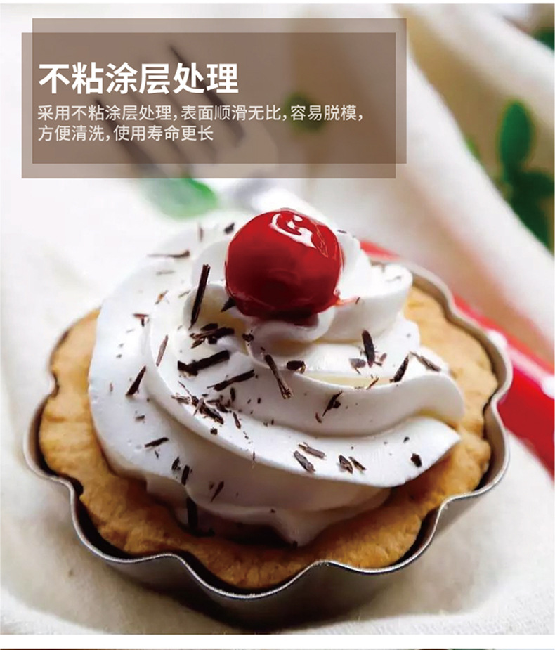 Constructed from heavy-duty carbon steel, these Chrysanthemum Edge Tart Mold pieces offer excellent heat conductivity and durability. The carbon steel ensures rapid, even heat distribution, preventing issues like burnt bottoms or undercooked tops in your tarts and puddings. The non-stick coating is certified food-safe and free from PFOA and other harmful substances, guaranteeing healthy baking. Compared to ordinary aluminum molds, the Chrysanthemum Edge Tart Mold is more wear-resistant and offers a longer service life.