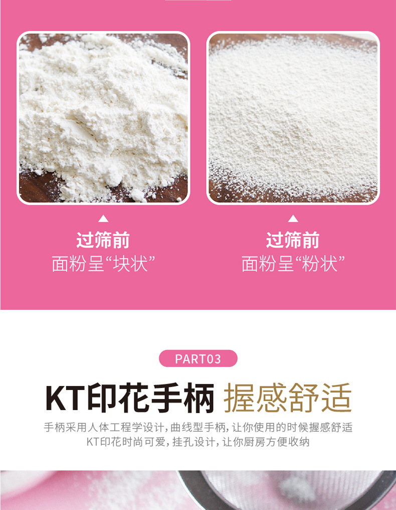 The attention to detail in this premium Kitchen Sifter is evident in every aspect of its construction. The reinforced handle joints of this durable Flour Sifter prevent loosening over time, while the precision-welded mesh ensures consistent performance. The smooth, rounded edges of this professional Baking Sifter prevent ingredient accumulation and facilitate easy cleaning. The vibrant KITTY304 branding adds a touch of personality while maintaining a professional appearance.